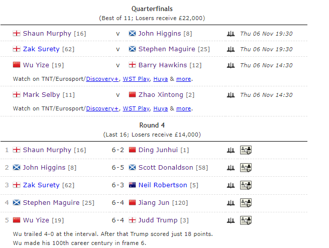 1/8决赛晚间场,丁俊晖以2-6输给老敌手墨菲,江俊以4-6不敌马奎尔,罗伯逊3-6输给舒尔蒂、希金斯6-5险胜唐纳森。今天的1/4决赛,赵心童迎战塞尔比、吴宜泽对阵霍金斯,期待他们的好音问!另外两场比赛对阵为墨菲与希金斯献技强强对话,舒尔第挑战名将马奎尔。